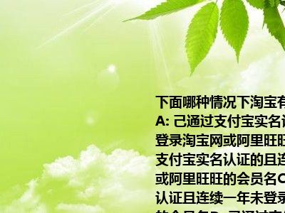 下面哪种情况下淘宝有权收回会员名(()A: 己通过支付宝实名认证的且连续三年未登录淘宝网或阿里旺旺的会员名B: 已通过支付宝实名认证的且连续二年未登录淘宝网或阿里旺旺的会员名C: 未通过支付宝实名认证且连续一年未登录淘宝网或阿里旺旺的会员名D: 已通过支付宝实名认证的且连续一年未登录淘宝网或阿里旺旺的会员名","title_text":"下面哪种情况下淘宝有权收回会员名 ()A: 己通过支付宝实名认证的且连续三年未登录淘宝网或阿里旺旺的会员名B: 已通过支付宝实名认证的且连续二年未登录淘宝网或阿里旺旺的会员名C: 未通过支付宝实名认证且连续一年未登录淘宝网或阿里旺旺的会员名D: 已通过支付宝实名认证的且连续一年未登录淘宝网或阿里旺旺的会员名)