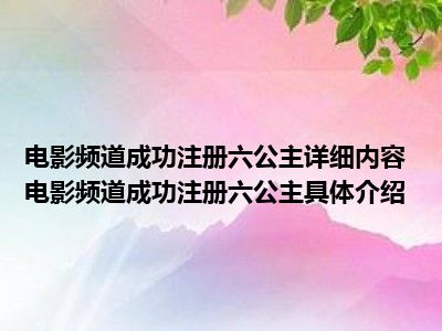 想必大家现在对于电影频道成功注册“六公主”方面的信息都是比较想了解的吧,那么针对于电影频道成功注册“六公主”方面的信息,小西自然是收集了一些相关方面的信息,那么如果您感兴趣的话,可以看下下面小西为大家收集到与电影频道成功注册“六公主”相关的信息吧。