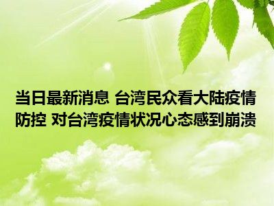 台湾民众看大陆疫情防控 对台湾疫情状况心态感到崩溃现在是大家比较关注的,因为目前台湾民众看大陆疫情防控 对台湾疫情状况心态感到崩溃的热度是相对比较高的,那么既然大家对此都比较感兴趣,小S也是特地到网上去查找了一些相关的信息,下面就由小S来把这些信息来分享给大家一起查阅吧。