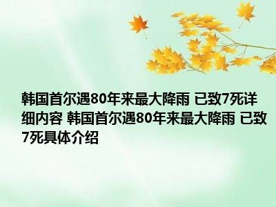 据韩联社报道,韩国首都首尔及周边地区8日晚遭遇80年来最大降雨,造成7人死亡、9人受伤、6人失踪,有房屋、建筑、车辆和地铁站被淹。