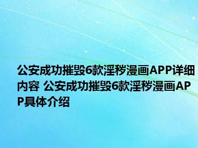 想必大家现在对于公安成功摧毁6款淫秽漫画APP方面的信息都是比较想了解的吧,那么针对于公安成功摧毁6款淫秽漫画APP方面的信息,小西自然是收集了一些相关方面的信息,那么如果您感兴趣的话,可以看下下面小西为大家收集到与公安成功摧毁6款淫秽漫画APP相关的信息吧。