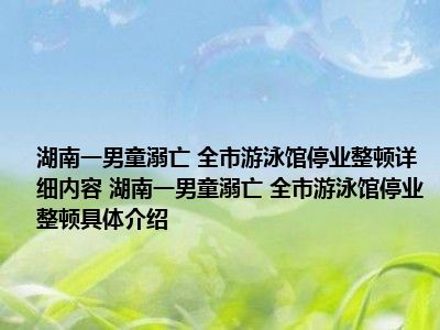 1、想必大家现在对于湖南一男童溺亡 全市游泳馆停业整顿方面的信息都是比较想了解的吧,那么针对于湖南一男童溺亡 全市游泳馆停业整顿方面的信息,小西自然是收集了一些相关方面的信息,那么如果您感兴趣的话,可以看下下面小西为大家收集到与湖南一男童溺亡 全市游泳馆停业整顿相关的信息吧。