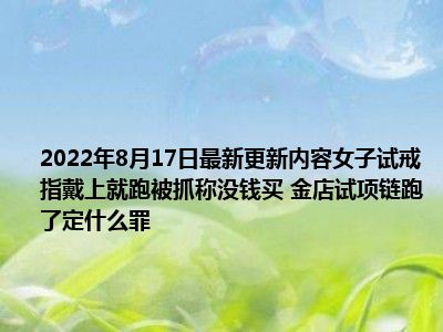 今天大家应该都在关注女子试戒指戴上就跑被抓称没钱买 金店试项链跑了定什么罪,那么很多小伙伴在关注的同时自然是想要了解到女子试戒指戴上就跑被抓称没钱买 金店试项链跑了定什么罪的具体来龙去脉了,新广小编今天也是特地在网络上搜集了一些相关的信息内容来分享给大家,感兴趣的小伙伴可以好好看下。
