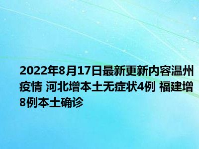 导读 今天大家应该都在关注温州疫情 河北增本土无症状4例 福建增8例本土确诊,那么很多小伙伴在关注的同时自然是想要了解到温州疫情 河北增
