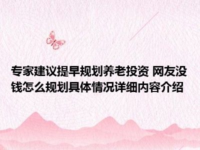 导读 想必大家现在对于专家:建议提早规划养老投资 网友:没钱怎么规划方面的消息都是比较想了解的吧,那么针对于专家:建议提早规划养老投资...