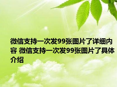 1、想必大家现在对于微信支持一次发99张图片了方面的信息都是比较想了解的吧,那么针对于微信支持一次发99张图片了方面的信息,小西自然是收集了一些相关方面的信息,那么如果您感兴趣的话,可以看下下面小西为大家收集到与微信支持一次发99张图片了相关的信息吧。