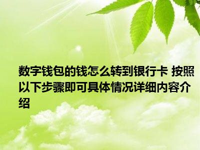 导读 想必大家现在对于数字钱包的钱怎么转到银行卡 按照以下步骤即可方面的消息都是比较想了解的吧,那么针对于数字钱包的钱怎么转到银行卡 ...
