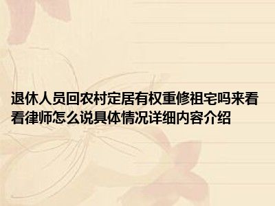 导读想必大家现在对于退休人员回农村定居有权重修祖宅吗来看看律师怎么说方面的消息都是比较想了解的吧,那么针对于退休人员回农村定居有权重...