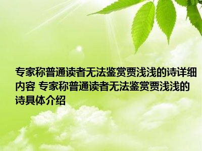 1、想必大家现在对于专家称普通读者无法鉴赏贾浅浅的诗方面的信息都是比较想了解的吧,那么针对于专家称普通读者无法鉴赏贾浅浅的诗方面的信息,小西自然是收集了一些相关方面的信息,那么如果您感兴趣的话,可以看下下面小西为大家收集到与专家称普通读者无法鉴赏贾浅浅的诗相关的信息吧。