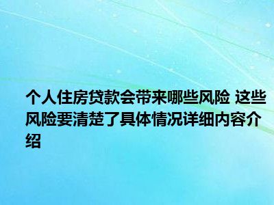 想必大家现在对于个人住房贷款会带来哪些风险 这些风险要清楚了方面的消息都是比较想了解的吧,那么针对于个人住房贷款会带来哪些风险 这些风险要清楚了方面的消息,小西自然是收集了一些相关方面的消息,那么如果您感兴趣的话,可以看下下面小西为大家收集到与个人住房贷款会带来哪些风险 这些风险要清楚了相关的消息吧。