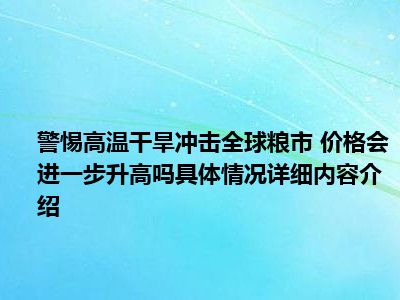 导读 想必大家现在对于警惕高温干旱冲击全球粮市 价格会进一步升高吗方面的消息都是比较想了解的吧,那么针对于警惕高温干旱冲击全球粮市 价...