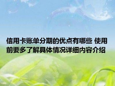 想必大家现在对于信用卡账单分期的优点有哪些 使用前要多了解!方面的消息都是比较想了解的吧,那么针对于信用卡账单分期的优点有哪些 使用前要多了解!方面的消息,小西自然是收集了一些相关方面的消息,那么如果您感兴趣的话,可以看下下面小西为大家收集到与信用卡账单分期的优点有哪些 使用前要多了解!相关的消息吧。