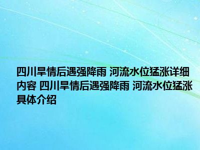 1、想必大家现在对于四川旱情后遇强降雨 河流水位猛涨方面的信息都是比较想了解的吧,那么针对于四川旱情后遇强降雨 河流水位猛涨方面的信息,小西自然是收集了一些相关方面的信息,那么如果您感兴趣的话,可以看下下面小西为大家收集到与四川旱情后遇强降雨 河流水位猛涨相关的信息吧。