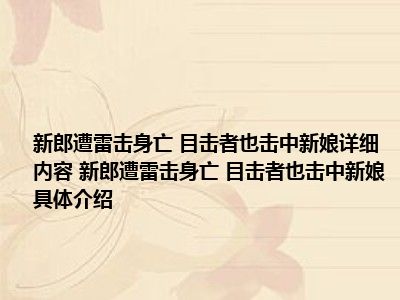 1、想必大家现在对于新郎遭雷击身亡 目击者:也击中新娘方面的信息都是比较想了解的吧,那么针对于新郎遭雷击身亡 目击者:也击中新娘方面的信息,小西自然是收集了一些相关方面的信息,那么如果您感兴趣的话,可以看下下面小西为大家收集到与新郎遭雷击身亡 目击者:也击中新娘相关的信息吧。