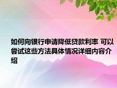 想必大家现在对于如何向银行申请降低贷款利率 可以尝试这些方法方面的消息都是比较想了解的吧,那么针对于如何向银行申请降低贷款利率 可以尝试这些方法方面的消息,小西自然是收集了一些相关方面的消息,那么如果您感兴趣的话,可以看下下面小西为大家收集到与如何向银行申请降低贷款利率 可以尝试这些方法相关的消息吧。