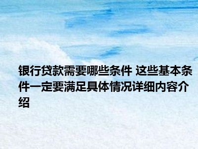 导读 想必大家现在对于银行贷款需要哪些条件 这些基本条件一定要满足!方面的消息都是比较想了解的吧,那么针对于银行贷款需要哪些条件 这些...