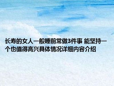 导读 想必大家现在对于长寿的女人一般睡前常做3件事 能坚持一个也值得高兴方面的消息都是比较想了解的吧,那么针对于长寿的女人一般睡前常做3...