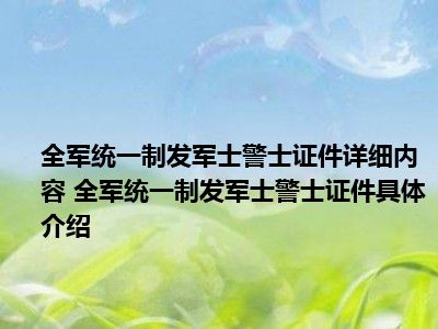1、想必大家现在对于全军统一制发军士警士证件方面的信息都是比较想了解的吧,那么针对于全军统一制发军士警士证件方面的信息,小西自然是收集了一些相关方面的信息,那么如果您感兴趣的话,可以看下下面小西为大家收集到与全军统一制发军士警士证件相关的信息吧。