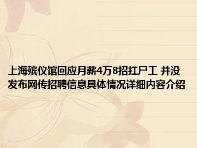 想必大家现在对于上海殡仪馆回应月薪4万8招扛尸工 并没发布网传招聘信息方面的消息都是比较想了解的吧,那么针对于上海殡仪馆回应月薪4万8招扛尸工 并没发布网传招聘信息方面的消息,小西自然是收集了一些相关方面的消息,那么如果您感兴趣的话,可以看下下面小西为大家收集到与上海殡仪馆回应月薪4万8招扛尸工 并没发布网传招聘信息相关的消息吧。