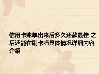 想必大家现在对于信用卡账单出来后多久还款最佳 之后还能在刷卡吗方面的消息都是比较想了解的吧,那么针对于信用卡账单出来后多久还款最佳 之后还能在刷卡吗方面的消息,小西自然是收集了一些相关方面的消息,那么如果您感兴趣的话,可以看下下面小西为大家收集到与信用卡账单出来后多久还款最佳 之后还能在刷卡吗相关的消息吧。