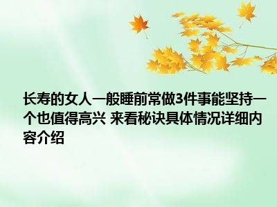 只有拥有健康的体魄,才能让自己长寿,所以,在日常中要多关爱自己的身体,要注意一些事项。你知道吗?长寿的女人,一般睡前常做3件事,能坚持一个,也值得高兴的。下面我们来看一下长寿的秘诀吧!