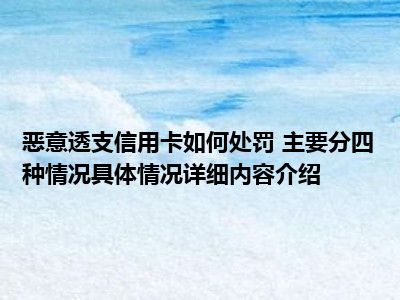 导读 想必大家现在对于恶意透支信用卡如何处罚 主要分四种情况方面的消息都是比较想了解的吧,那么针对于恶意透支信用卡如何处罚 主要分四种...