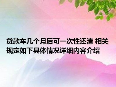 导读 想必大家现在对于贷款车几个月后可一次性还清 相关规定如下方面的消息都是比较想了解的吧,那么针对于贷款车几个月后可一次性还清 相关...