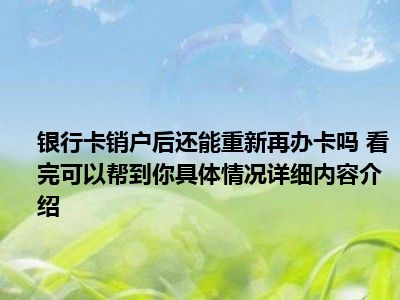 导读 想必大家现在对于银行卡销户后还能重新再办卡吗 看完可以帮到你!方面的消息都是比较想了解的吧,那么针对于银行卡销户后还能重新再办卡...
