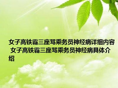1、想必大家现在对于女子高铁霸三座骂乘务员神经病方面的信息都是比较想了解的吧,那么针对于女子高铁霸三座骂乘务员神经病方面的信息,小西自然是收集了一些相关方面的信息,那么如果您感兴趣的话,可以看下下面小西为大家收集到与女子高铁霸三座骂乘务员神经病相关的信息吧。