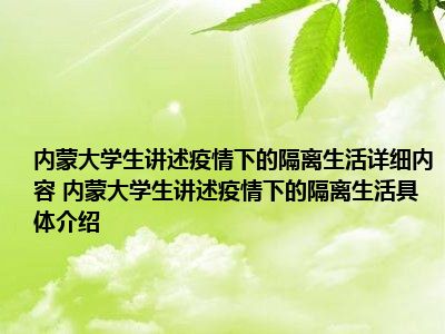 1、想必大家现在对于内蒙大学生讲述疫情下的隔离生活方面的信息都是比较想了解的吧,那么针对于内蒙大学生讲述疫情下的隔离生活方面的信息,小西自然是收集了一些相关方面的信息,那么如果您感兴趣的话,可以看下下面小西为大家收集到与内蒙大学生讲述疫情下的隔离生活相关的信息吧。