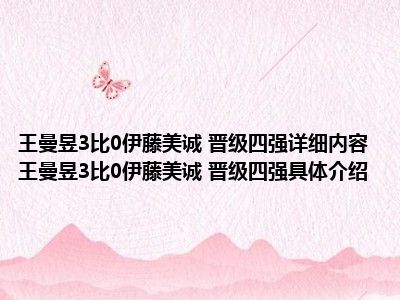 1、想必大家现在对于王曼昱3比0伊藤美诚 晋级四强方面的信息都是比较想了解的吧,那么针对于王曼昱3比0伊藤美诚 晋级四强方面的信息,小西自然是收集了一些相关方面的信息,那么如果您感兴趣的话,可以看下下面小西为大家收集到与王曼昱3比0伊藤美诚 晋级四强相关的信息吧。