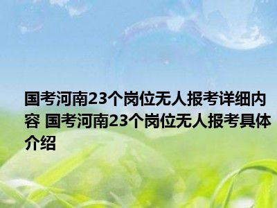1、想必大家现在对于国考河南23个岗位无人报考方面的信息都是比较想了解的吧,那么针对于国考河南23个岗位无人报考方面的信息,小西自然是收集了一些相关方面的信息,那么如果您感兴趣的话,可以看下下面小西为大家收集到与国考河南23个岗位无人报考相关的信息吧。