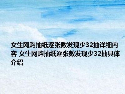 1、想必大家现在对于女生网购抽纸逐张数发现少32抽方面的信息都是比较想了解的吧,那么针对于女生网购抽纸逐张数发现少32抽方面的信息,小西自然是收集了一些相关方面的信息,那么如果您感兴趣的话,可以看下下面小西为大家收集到与女生网购抽纸逐张数发现少32抽相关的信息吧。