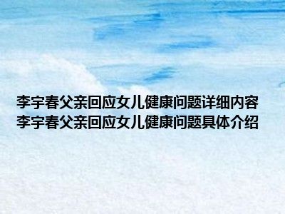 1、想必大家现在对于李宇春父亲回应女儿健康问题方面的信息都是比较想了解的吧,那么针对于李宇春父亲回应女儿健康问题方面的信息,小西自然是收集了一些相关方面的信息,那么如果您感兴趣的话,可以看下下面小西为大家收集到与李宇春父亲回应女儿健康问题相关的信息吧。
