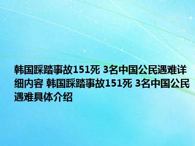 1、想必大家现在对于韩国踩踏事故151死 3名中国公民遇难方面的信息都是比较想了解的吧,那么针对于韩国踩踏事故151死 3名中国公民遇难方面的信息,小西自然是收集了一些相关方面的信息,那么如果您感兴趣的话,可以看下下面小西为大家收集到与韩国踩踏事故151死 3名中国公民遇难相关的信息吧。