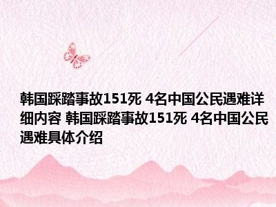 1、想必大家现在对于韩国踩踏事故151死 4名中国公民遇难方面的信息都是比较想了解的吧,那么针对于韩国踩踏事故151死 4名中国公民遇难方面的信息,小西自然是收集了一些相关方面的信息,那么如果您感兴趣的话,可以看下下面小西为大家收集到与韩国踩踏事故151死 4名中国公民遇难相关的信息吧。