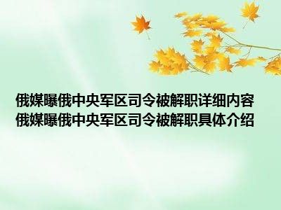 1、想必大家现在对于俄媒曝俄中央军区司令被解职方面的信息都是比较想了解的吧,那么针对于俄媒曝俄中央军区司令被解职方面的信息,小西自然是收集了一些相关方面的信息,那么如果您感兴趣的话,可以看下下面小西为大家收集到与俄媒曝俄中央军区司令被解职相关的信息吧。
