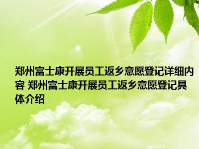 1、想必大家现在对于郑州富士康开展员工返乡意愿登记方面的信息都是比较想了解的吧,那么针对于郑州富士康开展员工返乡意愿登记方面的信息,小西自然是收集了一些相关方面的信息,那么如果您感兴趣的话,可以看下下面小西为大家收集到与郑州富士康开展员工返乡意愿登记相关的信息吧。