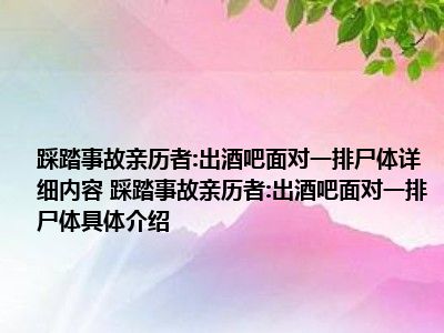 1、想必大家现在对于踩踏事故亲历者:出酒吧面对一排尸体方面的信息都是比较想了解的吧,那么针对于踩踏事故亲历者:出酒吧面对一排尸体方面的信息,小西自然是收集了一些相关方面的信息,那么如果您感兴趣的话,可以看下下面小西为大家收集到与踩踏事故亲历者:出酒吧面对一排尸体相关的信息吧。