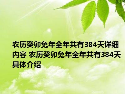 1、 想必大家现在对于农历癸卯兔年全年共有384天方面的信息都是比较想了解的吧,那么针对于农历癸卯兔年全年共有384天方面的信息,小西自然是收集了一些相关方面的信息,那么如果您感兴趣的话,可以看下下面小西为大家收集到与农历癸卯兔年全年共有384天相关的信息吧。