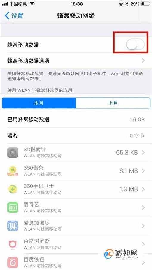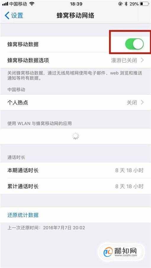 接着点击开启蜂窝移动数据开关,如下图所示。