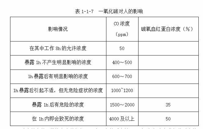 表1-1-7 一氧化碳对人的影响