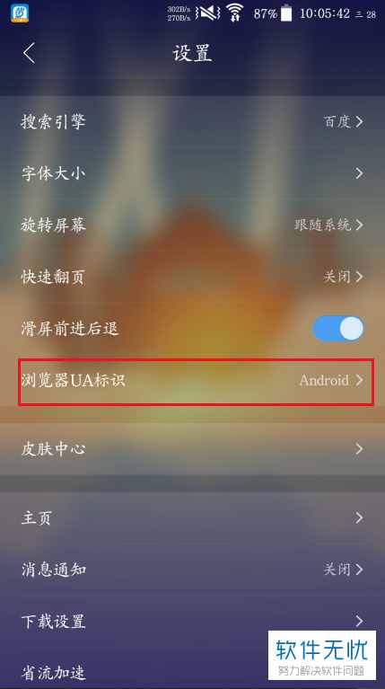 进入设置界面后,我们点击如下图的 浏览器UA标识。