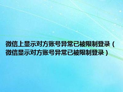 导读 1、微信显示对方账号异常已被限制登录2、微信显示对方账号异常已被限制登录,很可能是你朋友的账户出了问题,也就是说,被封了。很可能是使