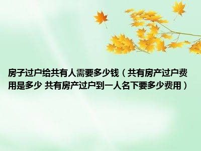 共有房产过户到一人名下需要的费用,如以下几点内容:办理夫妻更名手续只需提供房产证印花税5元,其余任何费用均不需交纳。办理夫妻房产证更名手续的前提是已取得房屋所有权证,办理手续时需夫妻双方同时到场,填写《房屋所有权登记申请书》,具体提交的证件因房屋性质的不同而有所不同,具体提交资料如下:(1)如是房改房,需提供原售房单位的证明,写明因供暖原因允许将产权人变更为配偶的名字;如是商品房、经济适用房,夫妻双方写变更申请并简单注明理由;(2)结婚证复印件(核验原件)(3)夫妻双方的身份证复印件(核对原件);(4)夫妻双方共有房屋的协议(5)房屋所有权证;(6)房改房提供原购房契约复印件(核对原件);(7)屋所有权证附图、登记表复印件。如果证中没有图的可不提供,登记表不复印原产权人姓名;办理夫妻更名手续只需提供房产证印花税5元,其余任何费用均不需交纳。夫妻房产证过户的条件:同时也称为夫妻房产证变更,首先必须是非按揭房,如果还有按揭就必须要银行盖章。一般情况下银行不给盖章,似各个银行情况而定。要想夫妻房产证更名,在婚姻存续期间添加配偶姓名可以直接添加,只需携带结婚证、房屋两证、身份证原件及复印件到房产交易中心“变更登记”窗口办理即可。