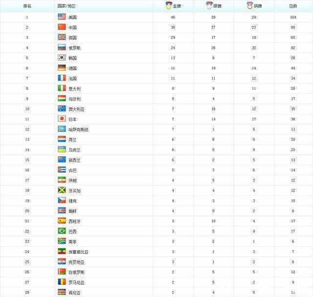 在伦敦奥运会上,尽管东道主英国利用主场优势大手笔地摘金夺银,可中国健儿也保持高歌猛进,力压英国,保持着世界第二的排名。曾经荣光无限的俄罗斯逐步掉队,跌出前三。