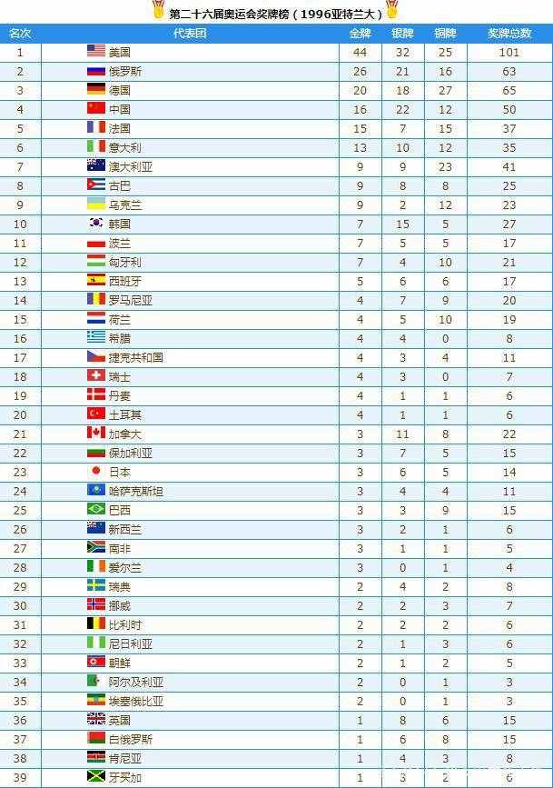 1996年亚特兰大奥运会奖牌榜
