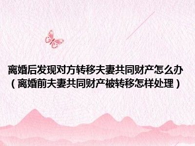 目前大家应该是对离婚前夫妻共同财产被转移怎样处理比较感兴趣的,所以今天CC就来为大家整理了一些关于离婚前夫妻共同财产被转移怎样处理方面的相关知识来分享给大家,希望大家会喜欢哦。