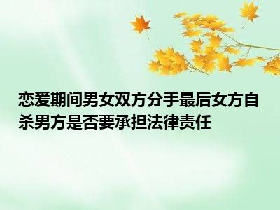 目前大家应该是对恋爱期间的男女双方分手最后女方自杀,男方是否要承担法律责任比较感兴趣的,所以今天CC就来为大家整理了一些关于恋爱期间的男女双方分手最后女方自杀,男方是否要承担法律责任方面的相关知识来分享给大家,希望大家会喜欢哦。