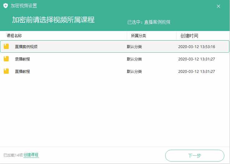 加密视频设置,加密前选择视频课程,未授权的需先登录后台进行授权课程。